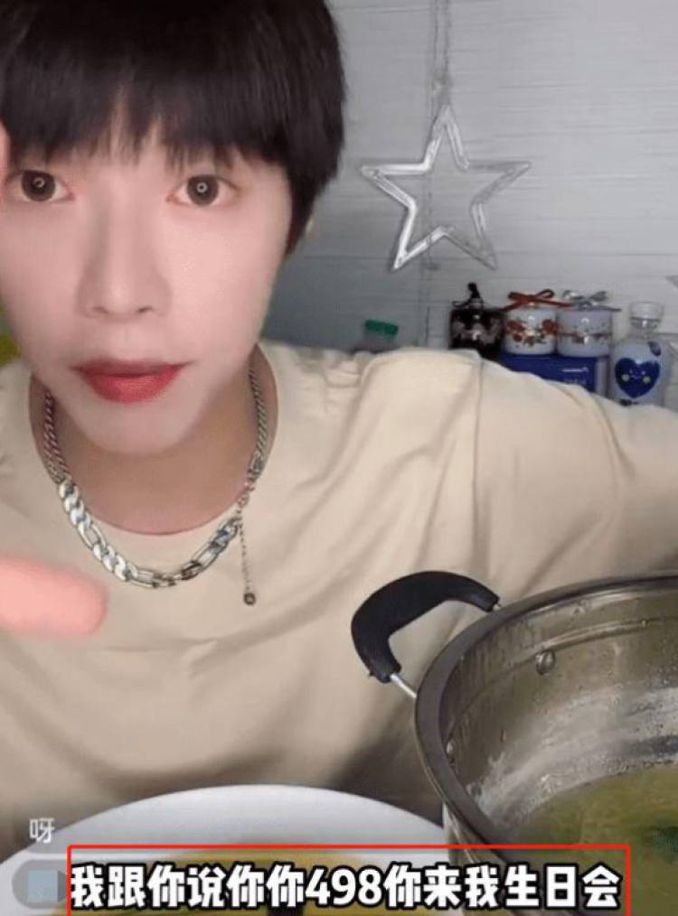 7月5日的直播中,他让粉丝买生日会 498 元的门票,并表示:" 我既能给你们唱歌演戏,又能给你们发疯,多全能的一个艺人,还在这里挑三拣四。"