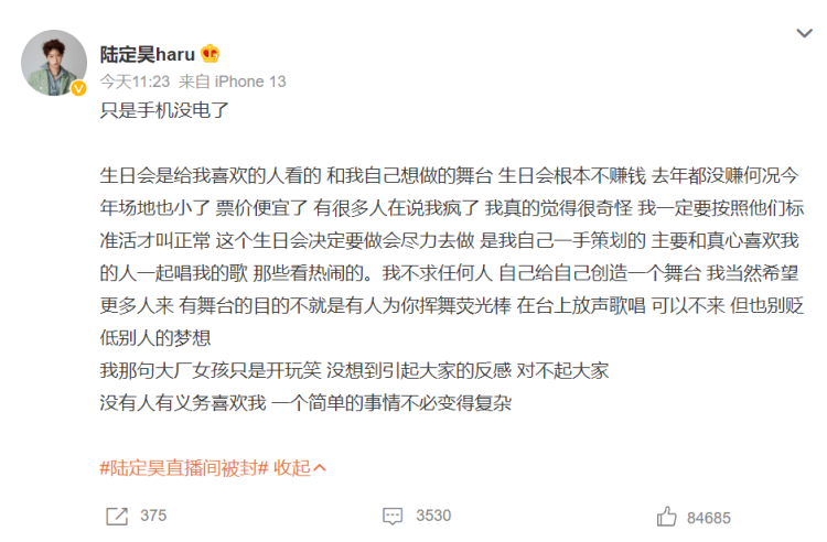 此外,他也回复了网友们对他的质疑,他表示 " 我手机没电了 "" 只是提前告知票很难卖 ,担心生日会办不下来 "" 我直播间有很多黑粉 "……之后,他还对之前直播间中关于 " 大厂女孩 " 的不当言论进行了解释和道歉。最后,他希望 " 世界不要对我太坏 ",也并不想以这种方式被大家认识和讨论,让别人看自己的笑话。
