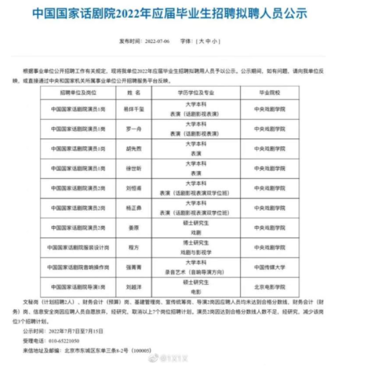 根据公示看,此次国话共招聘演员岗7名,2022届中央戏剧学院本科毕业生易烊千玺、罗一舟、胡先煦都为演员1岗。