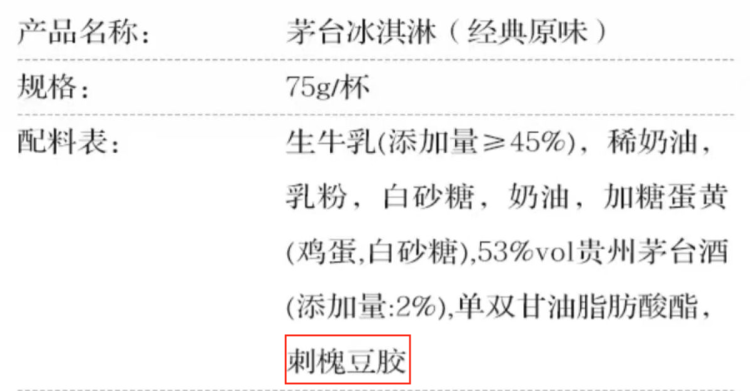 还有一些雪糕和冰淇淋含有卡拉胶或者其他胶,如茅台冰淇淋含有刺槐豆胶。