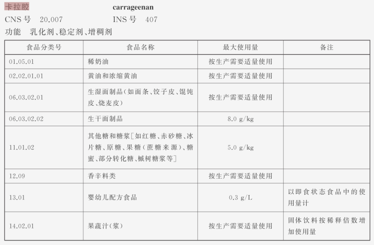 周到君翻阅了国家标准GB 2760-2014,发现卡拉胶被列在“可在各类食品中按生产需要适量使用的食品添加剂名单”。在生干面制品、糖和糖浆、婴幼儿配方食品领域有具体的最大使用量规定,分别是8g/kg,5g/kg,0.3g/L。