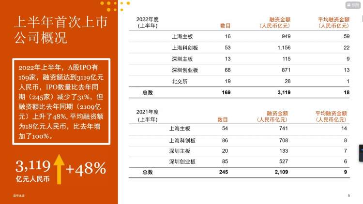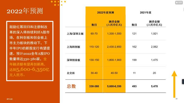 普华永道中国北部审计主管合伙人王崧表示:“今年上半年得益于多个大型上市项目的支持,沪深交易所新股总融资额占全球近一半。鼓励红筹回归及注册制改革的深入将持续利好A股市场,下半年新股发行有望提速,预计2022全年A股市场IPO企业数量将达330-380家,融资额有望再创新高,达到5600亿-6350亿元人民币。”