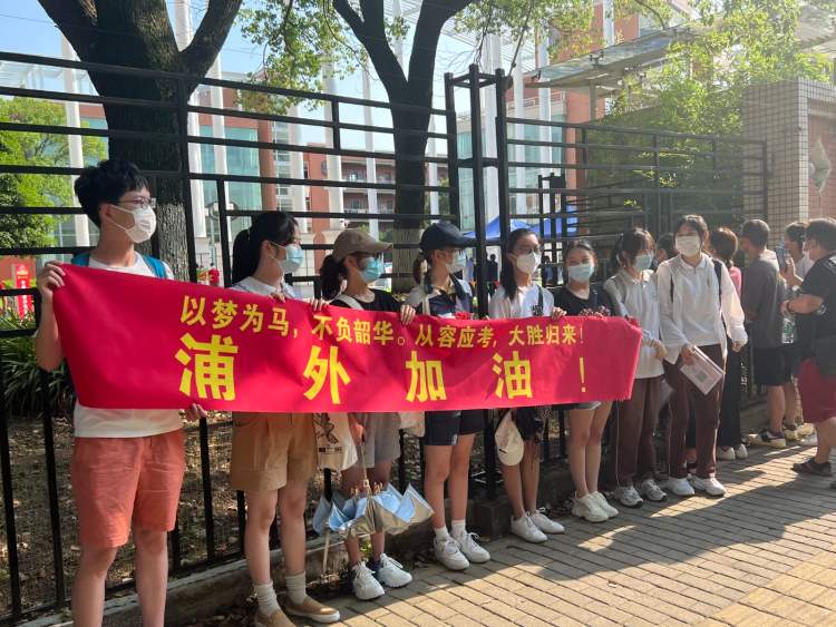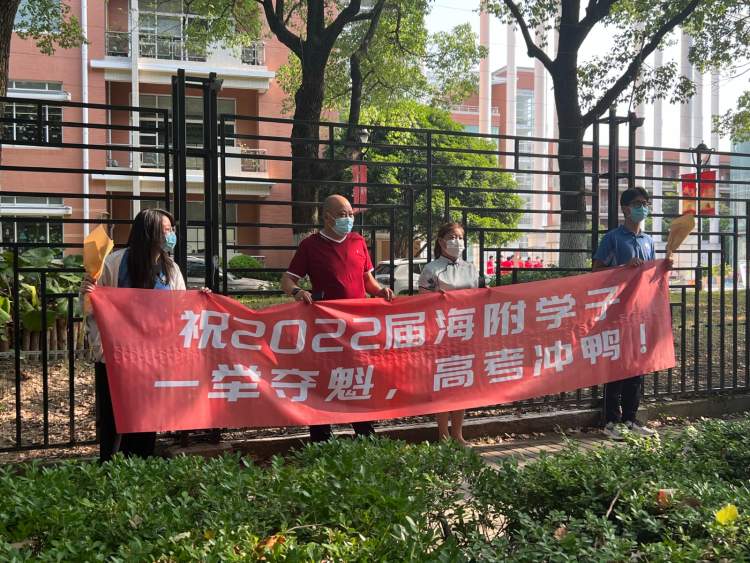 据了解,在此次的北蔡中学学生送考团里,是由十余名已经在春考中被录取的学生们自发组织的,他们每人手握一把向日葵,拉上给同学们加油的横幅——祝2022届海附学子一举夺魁,高考冲鸭!