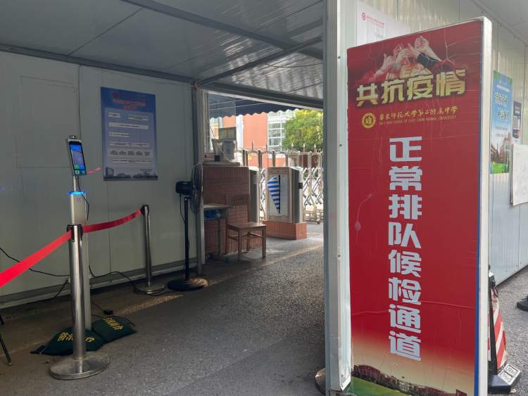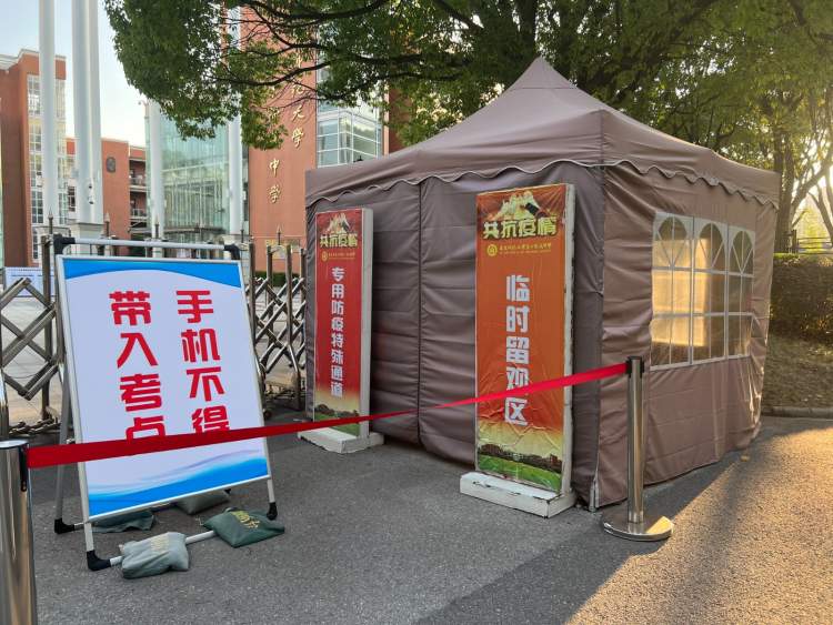 今天(7月7日)是上海高考的第一天,在华东师范大学第二附属中学考点处,记者发现,校门口两侧分别设立了“临时留观区”和“正常排队候检通道”,除此之外,还有“手机不得带入考点”、“请考生们出示两证”等两块立牌提醒着考生。
