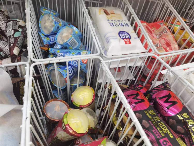然而价签之下,冰柜内左半部分全部堆放了牛排产品,而在右半部分仅有十来种冷饮,明显少于价签标示的品种。店员解释说因为“牛排太多了,冰淇淋没有地方放”。对于这种变化是一直以来还是新近出现,店员则不愿透露。