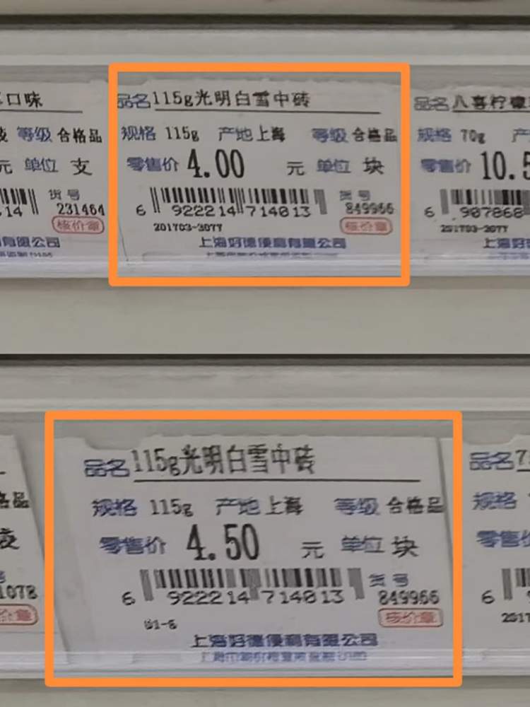 而且,115克光明白雪冰砖,同时出现了4元/块和4.5元/块的两张价签。