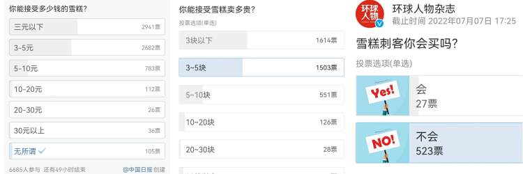 在近期微博媒体发布的多个网络投票中,可以看见选择“3元以内”和“3元到5元”的比例最高,可见青睐“5元以内”雪糕的占了压倒性的多数。