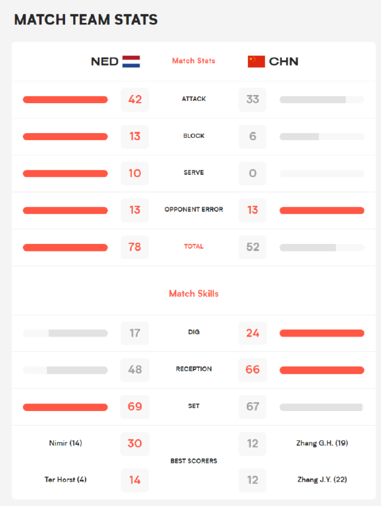 赛后统计显示,中国男排多项技术数据落后于对手,发球环节更是被对手以10:0胜出。全场比赛,尼米尔独自拿下30分,张景胤和张冠华分别为中国队拿下12分。