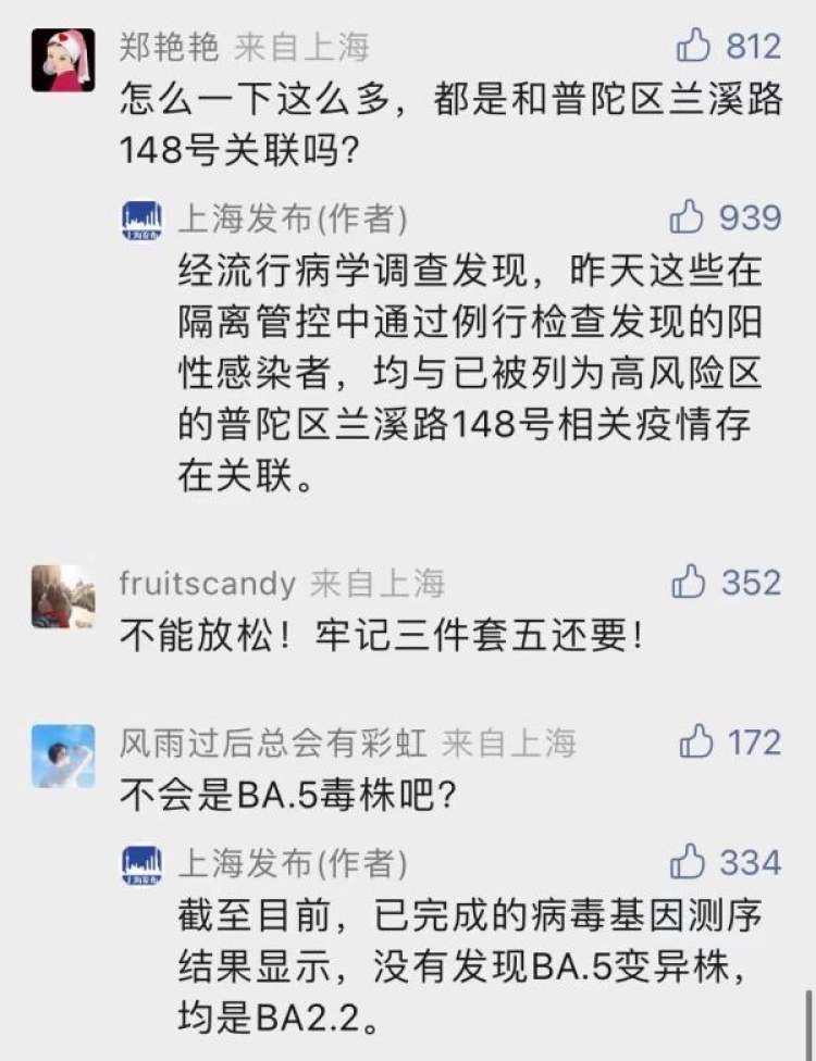上海有BA.5变异株吗?最新基因测序结果:均是BA2.2 陈里予 2022-7-07 来源:周到上海 上海有BA.5变异株吗? 7月6日(0-24时)上海新增本土确诊病例32例、本土无症状感染者22例,其中2例昨日已发布,其余均在闭环管控中发现。对此上海发布评论区网友提问:不会是BA.5毒株吧? 对此上海发布回应: 截至目前,已完成的病毒基因测序结果显示,没有发现BA.5变异株,均是BA2.2。 另外,经流行病学调查发现,昨天这些在隔离管控中通过例行检查发现的阳性感染者,均与已被列为高风险区的普陀区兰溪路148号相关疫情存在关联。 来源:周到上海 作者:陈里予 赞一个 (0)