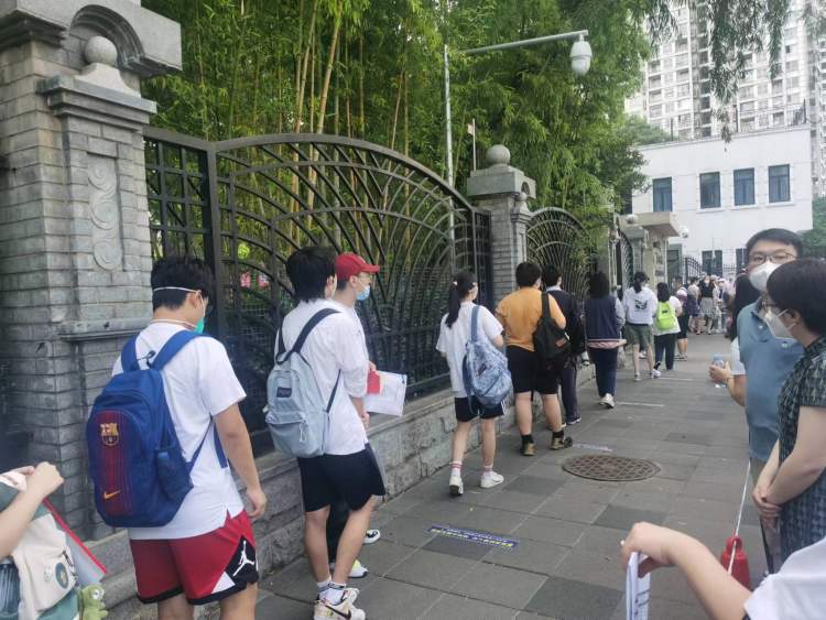 周到君来到长宁区高考考点市三女中门口,看到考点门口设置了一条线,线内站着一排考生,手里或是拿着一本书,在作最后的复习,或是拿着两证等候入场。现场秩序井然。