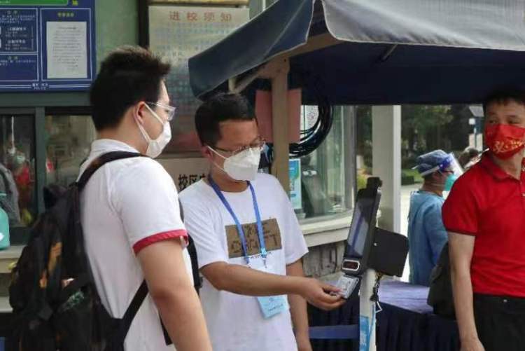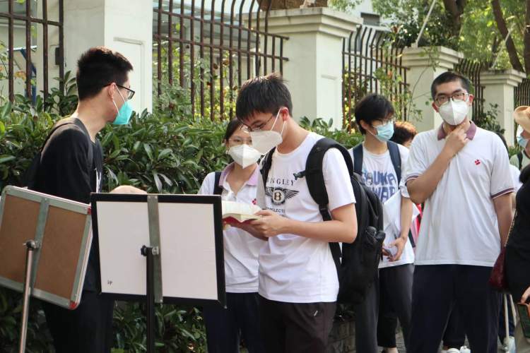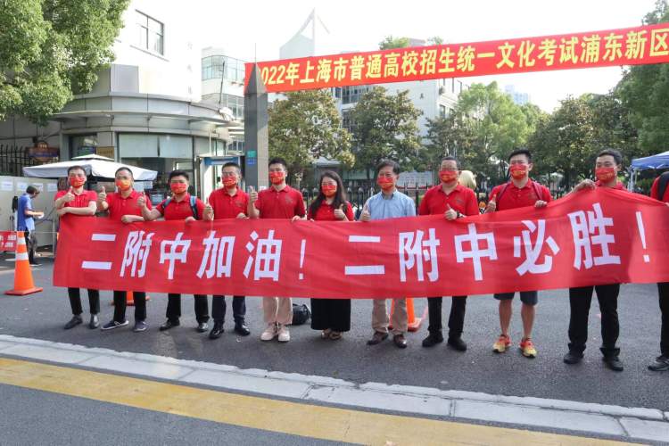 在考点前,华师大二附中的老师们身着大红色上衣,佩戴标有“必胜”字样的口罩迎接学生的到来,不少来自二附中的学子激动地上前与自己的老师握手、拥抱,老师们则亲切地回应,并以一句句“加油啊,一定加油啊”激励着他们的学生。除此之外,二附中老师还为学生们拉起了印有“二附中加油、二附中必胜”的横幅,承载了老师对学生们的期望。