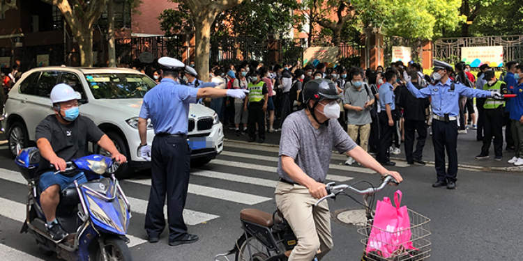 7月7日,上海推迟了一个月的高考“姗姗来迟”,针对全市100余个考点,公安机关出动了1万余名警辅安保力量,为5万余名高考学子“保驾护航”,确保高考安全、有序进行。