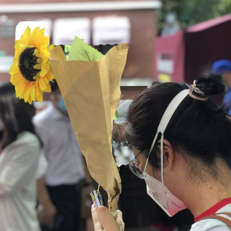 记者看到,这位老师的手里一直拿着一朵金黄色的向日葵,她说这是她为考生带来的祝福,寓意着“一举夺魁”,不远处,还有一位老师特地穿了一件“考的全都会,蒙的全都对”字样的T恤,为考生们加油助威。