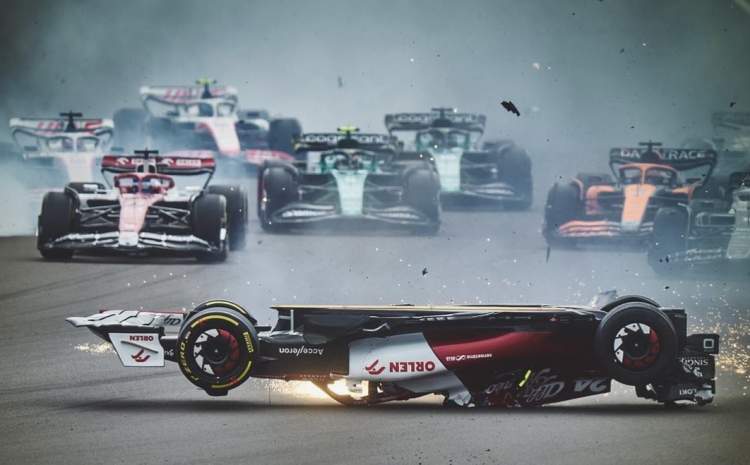一周前的英国站正赛,周冠宇的赛车在发车起步后被梅赛德斯车手拉塞尔的赛车顶到了右后轮。这导致周冠宇的赛车被撞得飞向空中后,车底朝上砸在赛道上,并四脚朝天地滑向赛道缓冲区的轮胎墙,然后又翻滚着撞到围栏才停下。