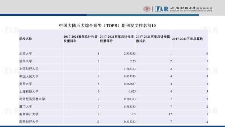 课题组还基于5大综合顶尖期刊论文发表情况进行了单独排名,前10名中国高校中北大、清华和上海财大稳居前3,处于第一梯队,其他属于第二梯队。田国强表示,中国高校取得显著进步的同时,与世界一流大学经济学研究力的差距依然巨大,任重道远,尤其是与世界领头的哈佛大学比,近五年在5大综合顶尖期刊发文数约6比150(1:25)。