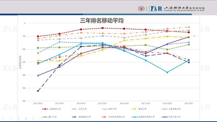 从三年和五年移动平均综合权重排名看,呈上升趋势的是一批注重推行国际化建设的综合性大学,包括北大、清华、中国人大等,其中中国人大上升显著。同时不少高校尤其是财经类高校明显下降,如首都经贸大学、对外经贸大学、西南财大和上海财大。