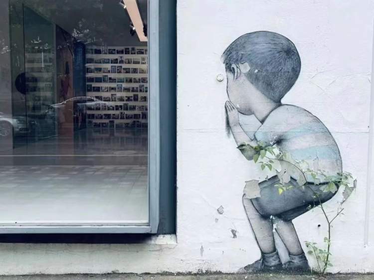在这漫长的3个月里, 2019年柒先生在M艺术空间举办第一次个展《弄堂里厢》时,在画廊入口处现场墙绘的小男孩的脚边,长出了一株神奇的小草。