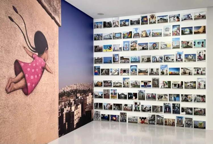 展览现场,从柒先生在世界各地墙绘的现场照中,精挑细选出100张作品图组成了一堵照片墙。
