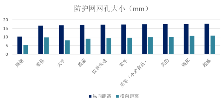 试验发现,9款样品的防护网网孔大小基本一致,纵向距离均在17mm左右。康铭的防护网网孔最小,纵向距离为10.25mm。