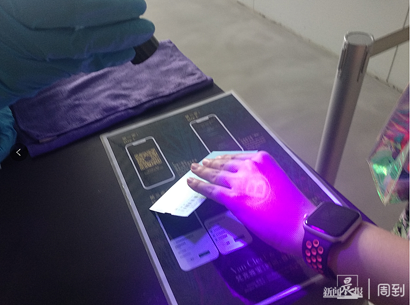 工作人员扫描参观者手背上的荧光标记
