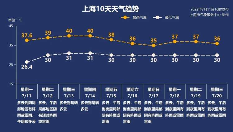 一浪高过一浪 申城气温周末可望降至35 ℃以下 周到君 2022-7-12 来源:周到上海 申城今日热力全开,以多云为主,最高气温又要升至39℃,最低起步也有30℃。午后局部地区阴有短时阵雨或雷雨,偏南风3-4级,大家出行可备一把晴雨伞。 持续多日的高温热浪还将“一浪高过一浪”,明后天又要冲击40℃,连午后雷雨都退避三舍、不见踪影。直到本周末,气温才会稍稍下滑到35℃。近期天气过热,容易引发身体不适,大家务必注意补水清热。 来源:周到上海 作者:周到君 赞一个 (0)
