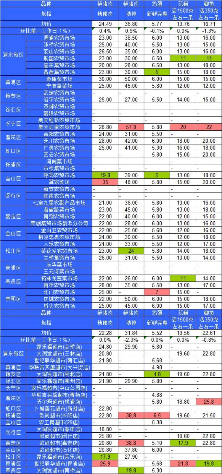 ■粉底标注代表该肉蛋鱼品种在上述农贸市场或超市的最高价;绿底标注代表该肉蛋鱼品种在上述农贸市场或超市的最低价