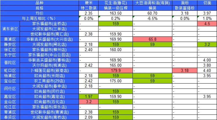 ■粉底标注代表该粮油品种在上述超市的最高价;绿底标注代表该粮油品种在上述超市的最低价