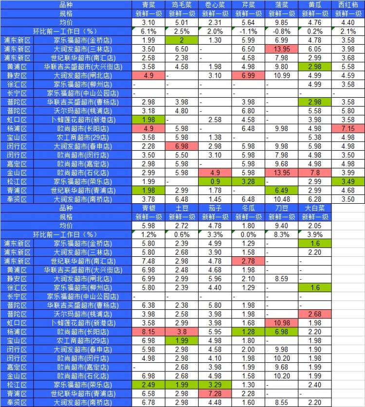 ■粉底标注代表该蔬菜品种在上述农贸市场或超市的最高价;绿底标注代表该蔬菜品种在上述农贸市场或超市的最低价