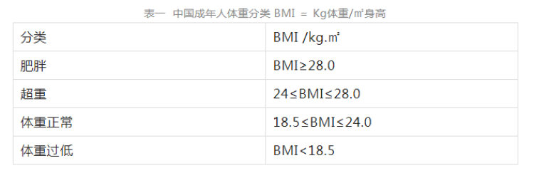 目前医学界普遍使用的体型判断指标。体重指数=体重(公斤)除以身高(米)的平方,这个数值在18.5~23.9之间,属于正常。如果高于23.9,就需要减重;低于18.5属于消瘦,应加强营养。