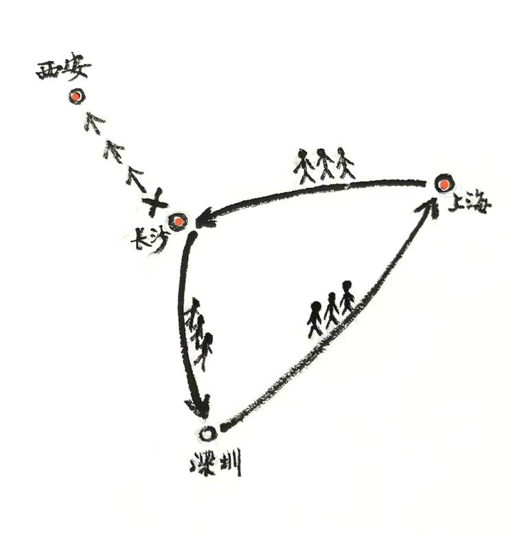蒋天的旅行线路图:从上海出发去长沙,放弃西安之行,临时改道前往深圳,最后回到上海 (插图By 罗志华)