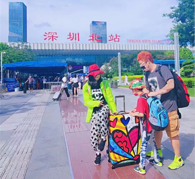 蒋天带着两个孩子走出深圳北站