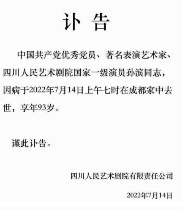 7月14日,四川人民艺术剧院发布一则讣告——国家一级演员,四川人艺艺术家孙滨同志因病在成都家中去世,享年93岁。