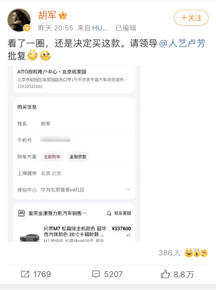 昨晚胡军微博撒糖,买车微博@太太“求批准”,网友大呼“中年夫妻撒糖太甜了”,也有网友调侃“明星只买三十多万的车?”。
