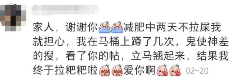 因为减肥两天没拉屎,看了你的帖,立马翘起来,结果我终于拉粑粑啦!