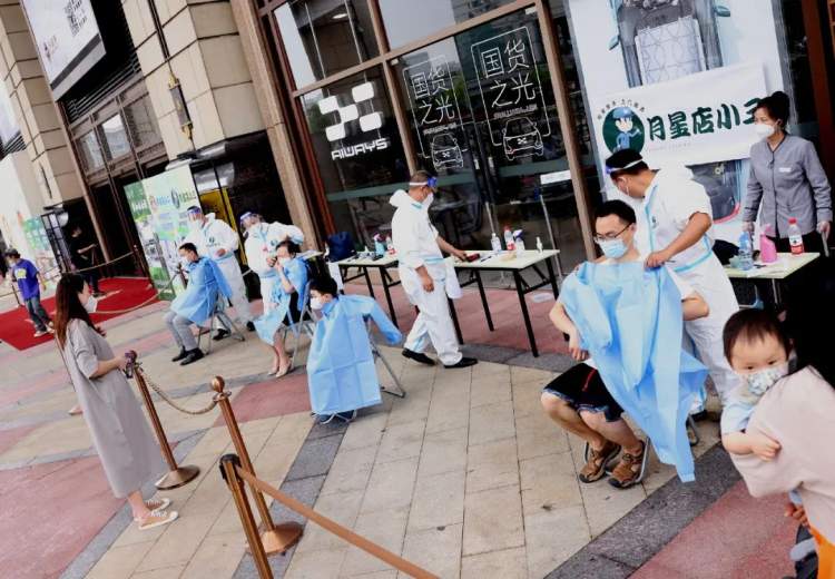 2022年7月8日,西安市曲江新区紫汀苑社区居民进行核酸检测。新华社记者 张博文 摄