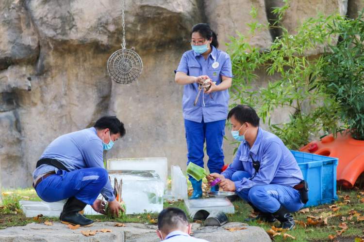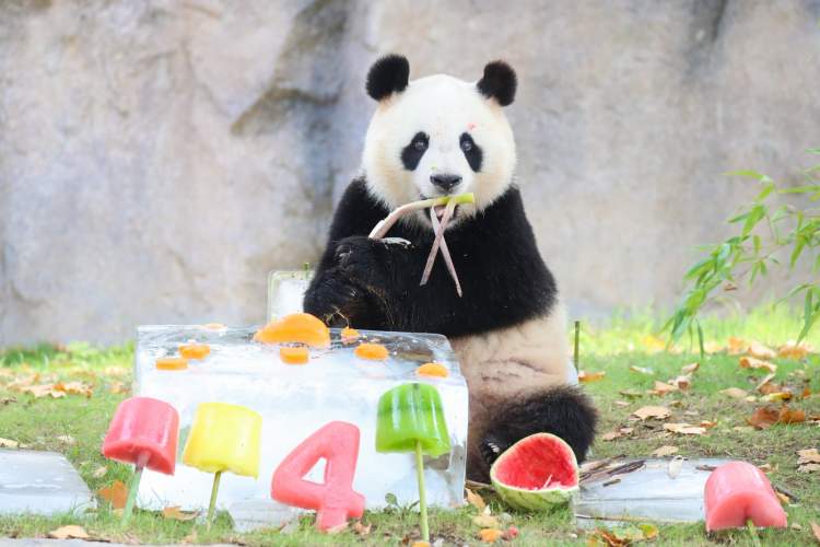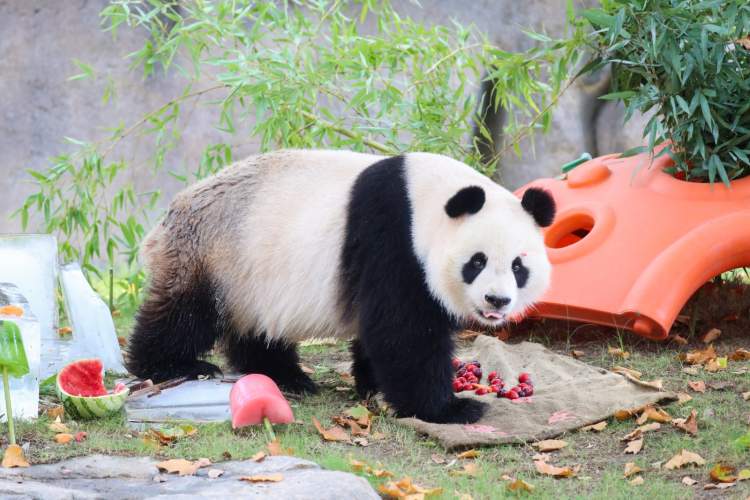 今天,上海野生动物园里的大熊猫“七七”迎来了4周岁的生日。一大早,大熊猫保育员们忙着布置生日现场。在大树底下,保育员们用冰块垒了个椅子和茶几,看着就无比清凉,冰茶几上放了胡萝卜和寿桃,一侧由西瓜掏空做成的果盘里装满了苹果、胡萝卜和鲜笋;茶几前摆放了一组竹叶味、芒果味和西瓜味的大“冰棒”,大大的“4”字摆在中间。