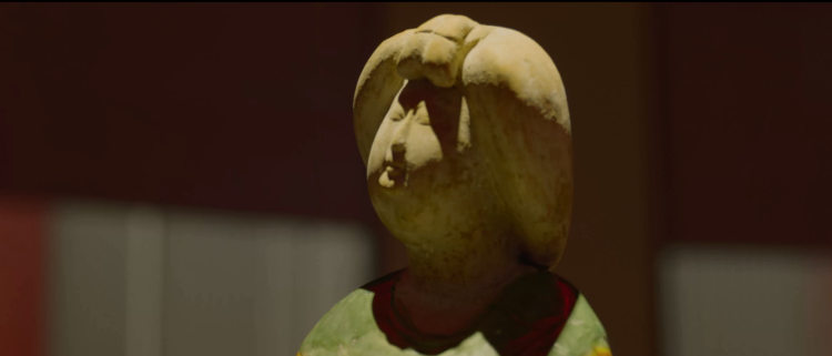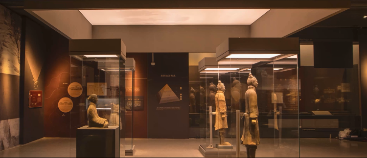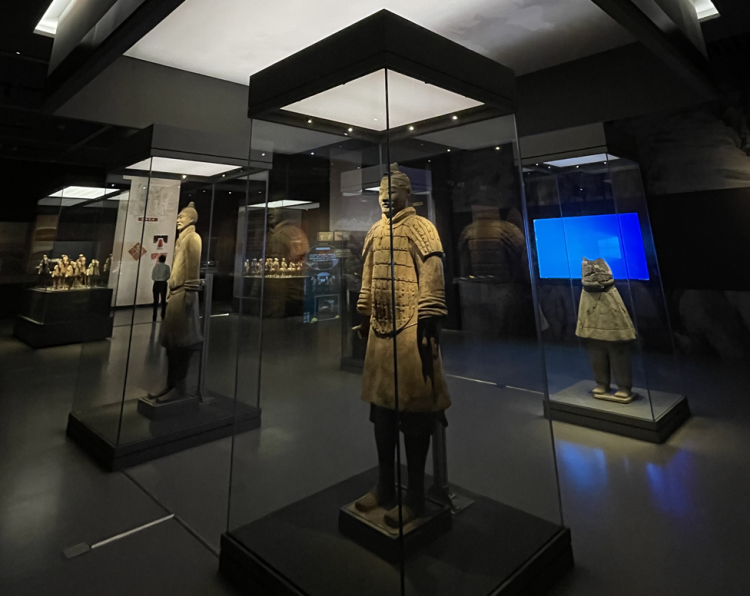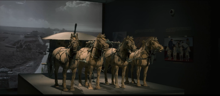 那么到了秦代的部分,大家能看到耳熟能详的铜车马和兵马俑。兵马俑我们选了四种形态:铠甲武士俑、战袍武士俑、跽坐俑,这三个俑形态是比较完整的,另外一件是只有半截下半身的武士俑。这一件展品它可以给我们看到的信息量也是非常大,它的结构、制作工艺,甚至于胎体的厚薄都能通过肉眼感受到,而且这件武士俑的背后大家可以注意看一下,它还有朱砂的红色痕迹。因为之前出土的兵马俑大多数都没有颜色,而这件残俑在其背后还能看到一定的颜色,无疑是比较珍贵的。