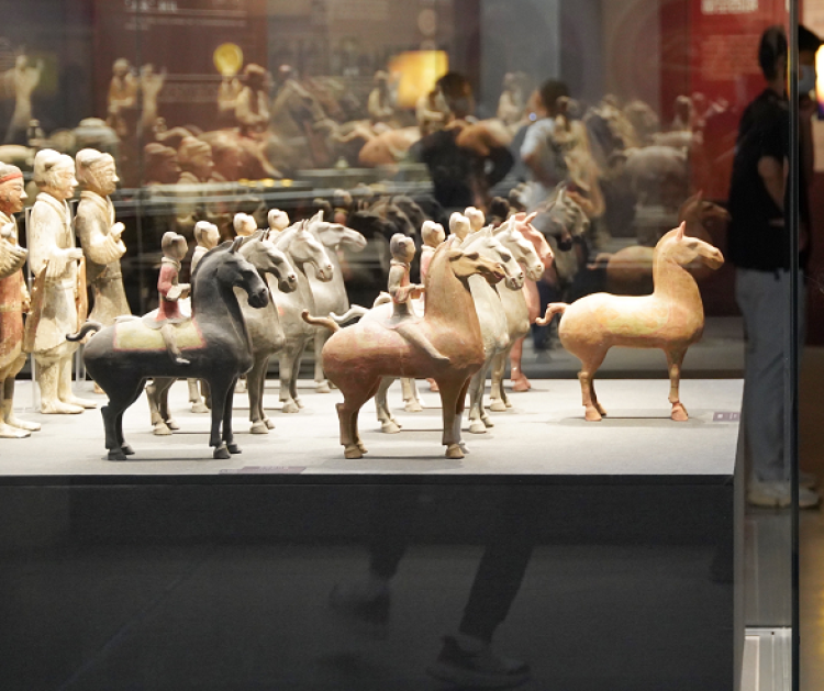 那么到了汉代展区的话,非常珍贵的就是汉景帝阳陵出土的两组骑马武士俑。这两件展品也是我们以成组成序列的状态呈现给观众的,它们代表了汉代的俑的制作工艺,还有当时的阵列情况,观众通过展览都可以做进一步的了解。