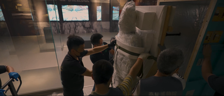 工作人员在现场对兵马俑展品进行开箱和拆除包装