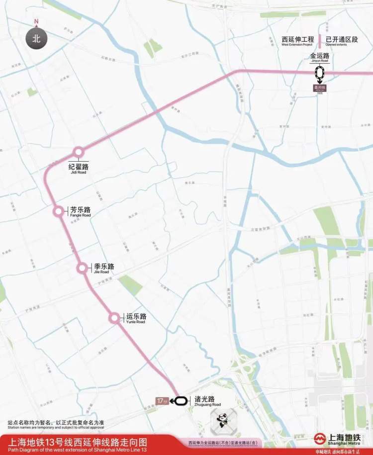13号线西延伸全长约9.47公里,沿金沙江西路—纪宏路—联友路—金丰路—诸光路走行,设车站5座,均为地下站。 线路途经嘉定区、闵行区、青浦区3个行政区,主要经过区域有国家会展中心(上海)、徐泾镇、华漕镇等。 这条线路一旦建成启用,不仅有利于保障国家会展中心的集散能力,对完善区域轨道交通线网功能也有重要作用。