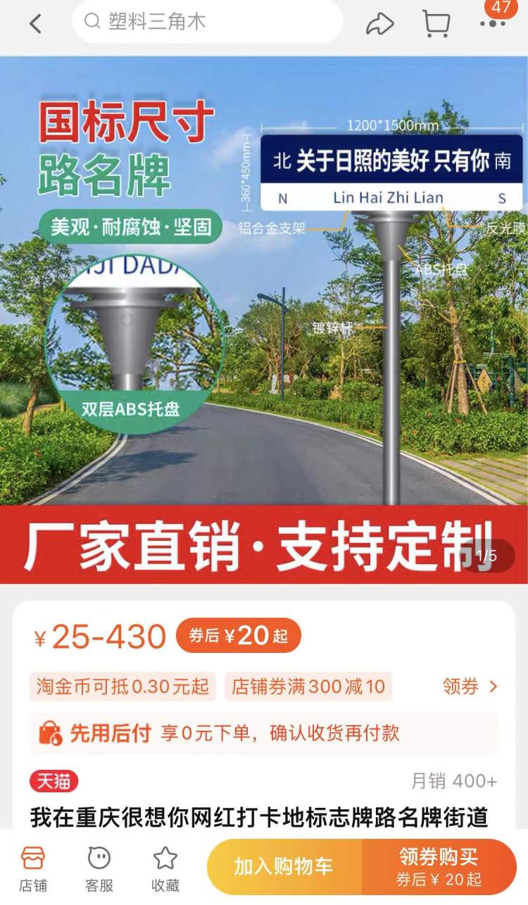 此外,记者还发现,在松江九亭一家咖啡店门口也出现了类似的指示牌,咖啡店店员表示,这块牌子是老板在网上定制的,因相关部门不允许摆在人行道上,所以摆在了店门口的小阳台处,这两天也有不少人来拍照打卡。记者进一步搜索淘宝等平台发现,这类指示牌花两三百元就可以定制,除了上海外,重庆、深圳等多地此前就已经出现过同样话语的指示牌。