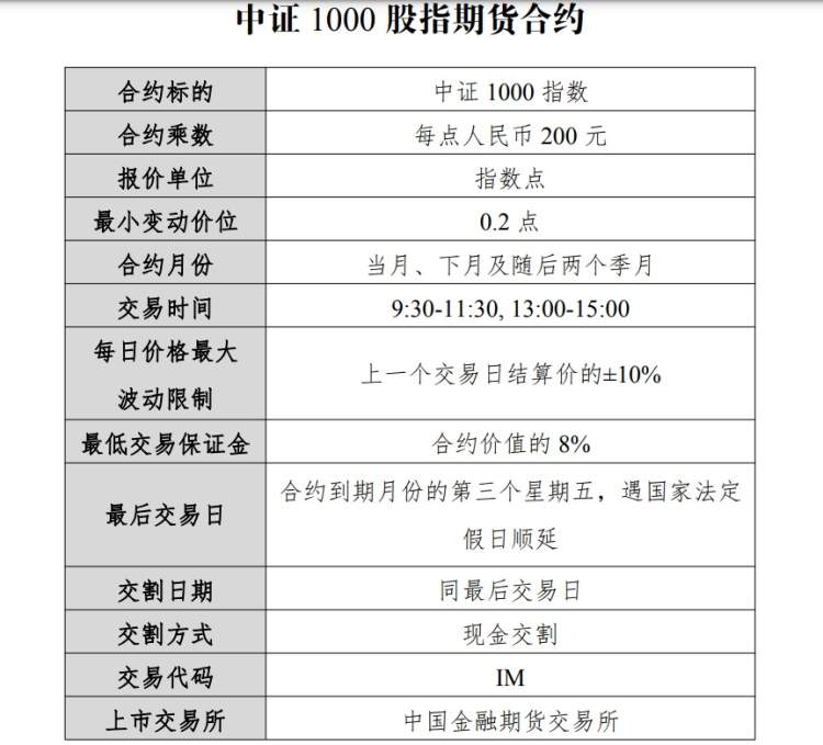 当晚中金所发布中证1000股指期货和股指期权合约及相关业务规则。中证1000股指期货合约交易代码为IM,合约乘数为每点人民币200元,最小变动单位为0.2点。其他主要条款均与现有已上市三个股指期货产品保持一致,比如涨跌停板幅度为上一交易日结算价的±10%;最低交易保证金标准为合约价值的8%。