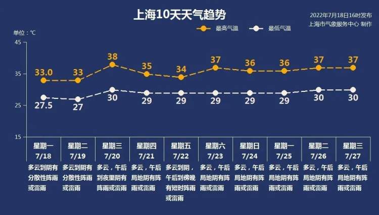 再凉一天,明天申城高温卷土重来,后面还有一连串高温候场 周到君 2022-7-19 来源:周到上海 今天本市云系较多,多云到阴为主。东南气流带来海上清凉空气,气温依然不会很高, 全天气温在27℃~33℃之间。不过需要注意,由于申城处在副热带高压边缘,会有分散性阵雨或雷雨出现。雷雨时风力较大,阵风7~9级,风向偏北,相对湿度95%~65%。 随着副热带高压再度加强北抬,明天起高温天气将卷土重来,最高气温预计在38℃附近。特别是23日开始,上海将是一连串高温候场,天气以多云为主。 来源:周到上海 作者:周到君 赞一个 (0)