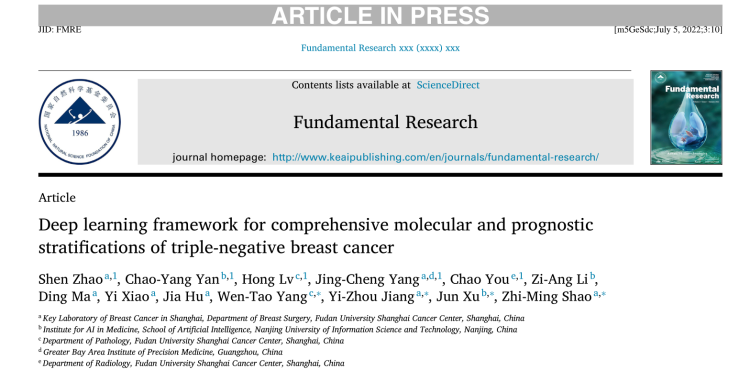 肿瘤医院邵志敏教授团队、杨文涛教授团队联合南京信息工程大学徐军教授团队,开展了基于数字病理与深度学习预测三阴性乳腺癌分子分型、关键治疗靶点和患者预后的研究,揭示了数字病理联合深度学习在预测三阴性乳腺癌关键生物标志物中的重要价值。该成果于国家自然科学基金委旗下期刊《基础研究》在线发表。