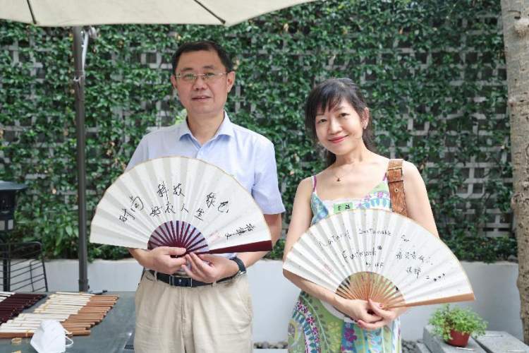中国纺织联合会上海办主任蒋伟文将“时尚、科技、绿色”写在了秘主精心准备的折扇上,廓形迷Molly写下了“Natural Sustainable Fur”梧桐树下,洋房院内,到场嘉宾轻摇折扇,扇面的“好衣态度”自然而鲜明,颇有古代文人墨客相逢一笑觅知音的雅趣。