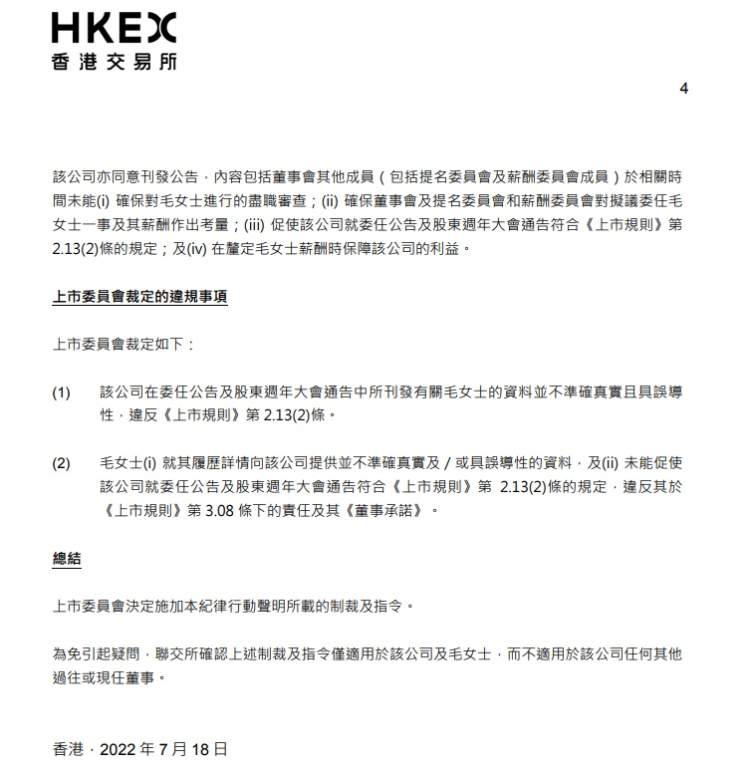 此外,毛俊杰2021年11月8日辞任该职务。在港交所上市科调查期间,毛俊杰承认当时某些语句纯粹是按她自己的意思诠释,与市场一般的理解未必相同。
