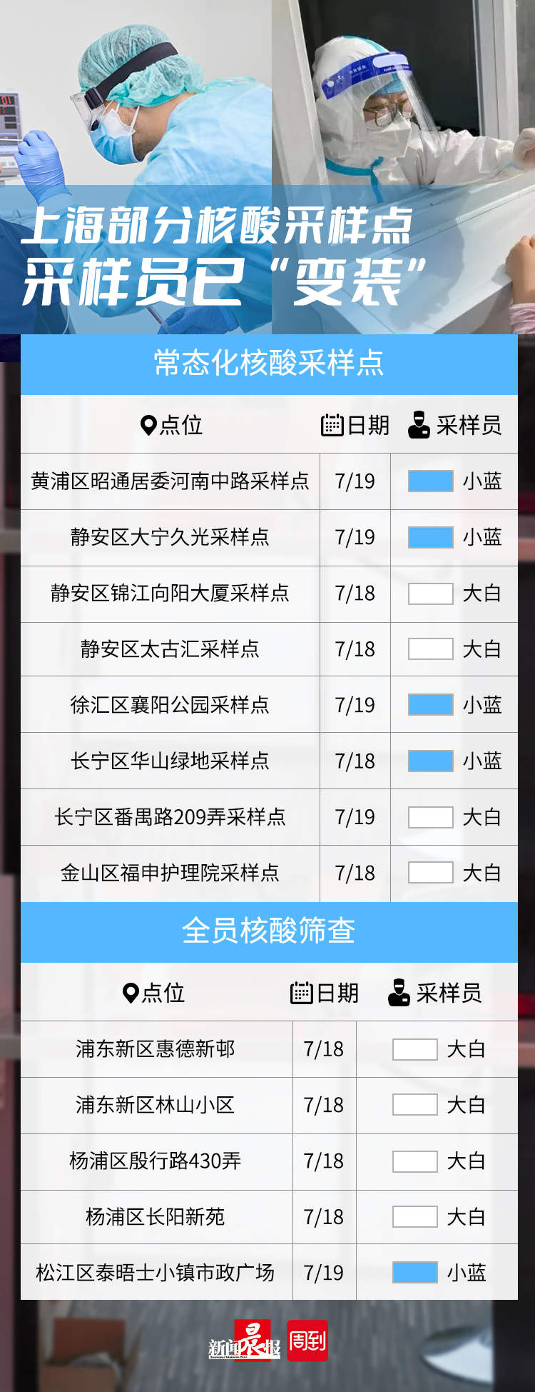 “昨天是‘大白’,今天都是穿‘小蓝’。”在黄浦区昭通居委河南中路常态化核酸采样点,昨天是采样员第一次没有穿“大白”,而是穿“小蓝”上岗。