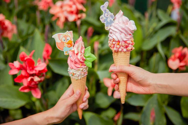 最新的冰淇淋和绵绵冰包括:玲娜贝儿西瓜风味冰淇淋蛋筒、唐老鸭华夫配西瓜风味冰淇淋及星黛露水蜜桃风味冰淇淋蛋筒,果香浓郁,口感清新。