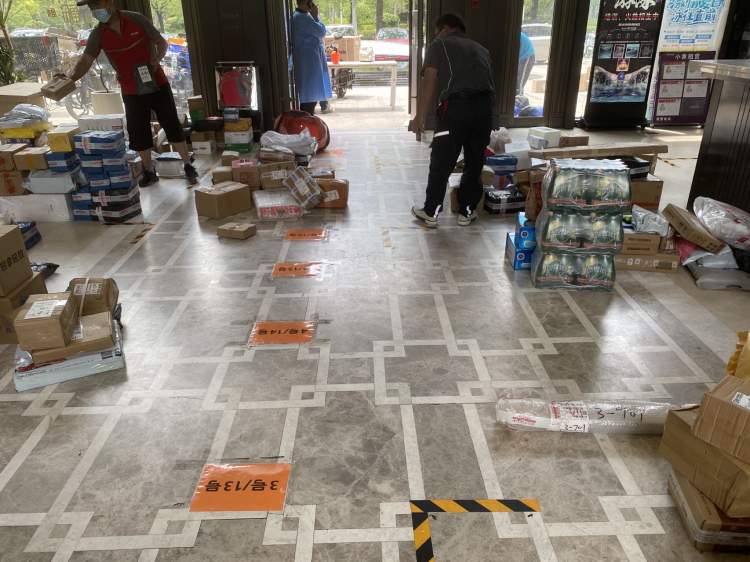 静安区大宁悦府小区接收快递的方式在月初也发生了改变,此前小区将西门大堂按照楼号划分区域,作为快递外卖的临时存放区,由物业进行统一接收并集中消毒后,业主再自行领取。