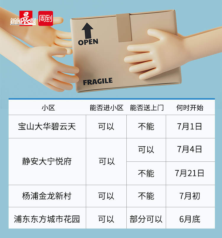 其中,杨浦金龙新村和宝山大华碧云天两个小区,目前只是快递从小区门口“前进”到了楼栋门口,暂时还不能送货上门。